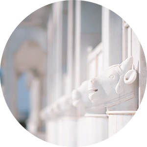 Circular sacred patterns called ‘Kolam’ are engraved near the entrance of each door to bio-energetically cleanse the body and open up subtle energy channels. The four cardinal directions marked with faces of four different animals carved in marble, are each meant to attract one specific aspect of energy into the seekers who walk past them: